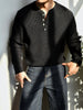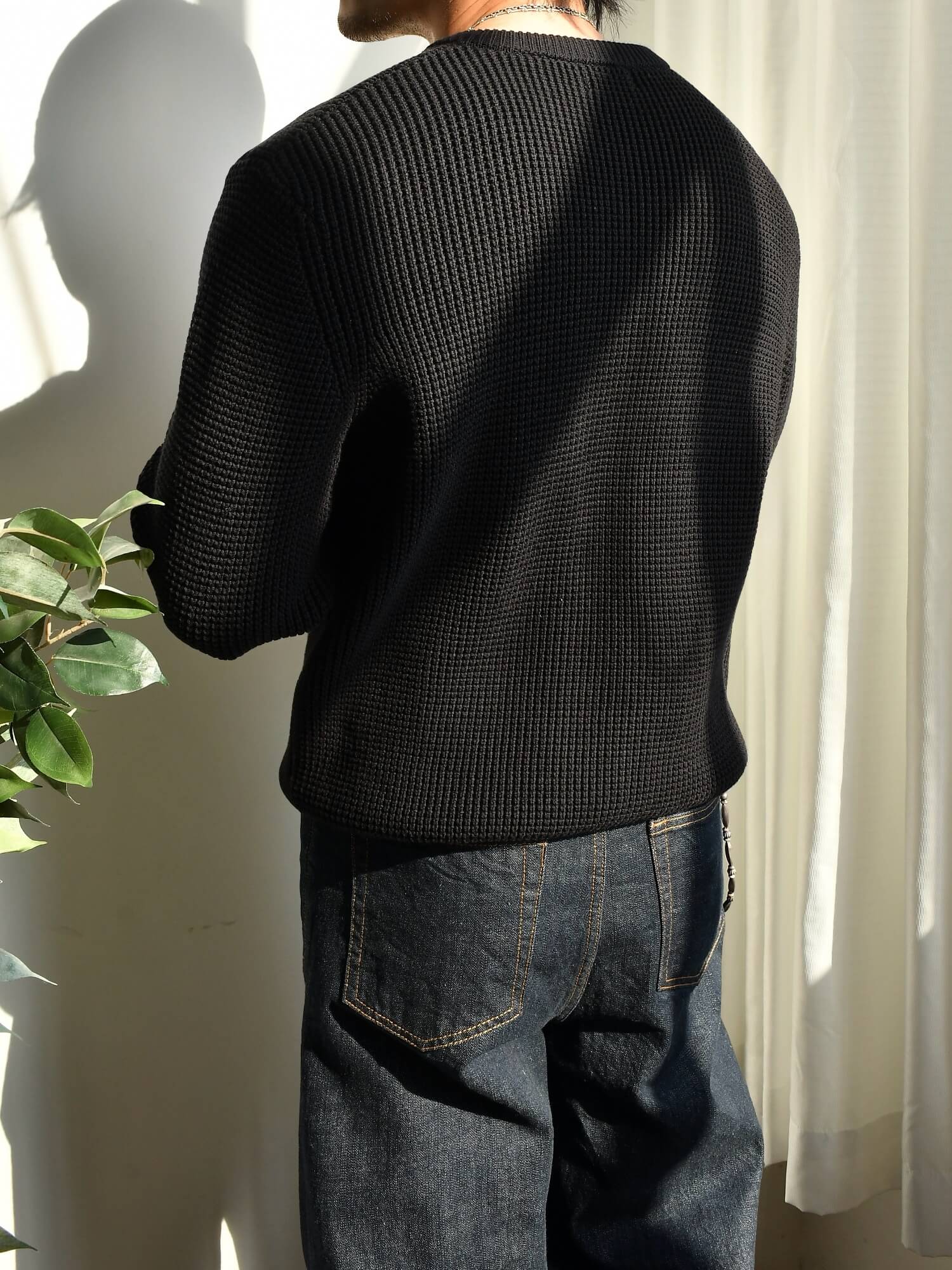 The textured waffle pattern not only adds visual interest but also enhances the fabric's breathability and cozy feel. Designed with a regular fit for easy, comfortable wear, this Henley is a timeless staple perfect for cool weather. Available in essential Black and clean White.