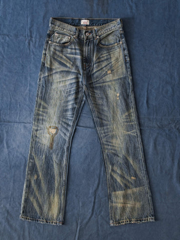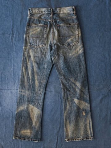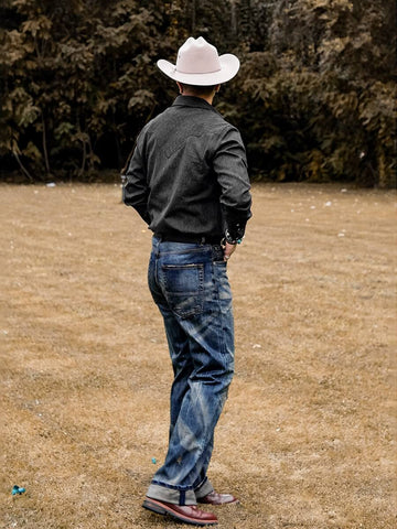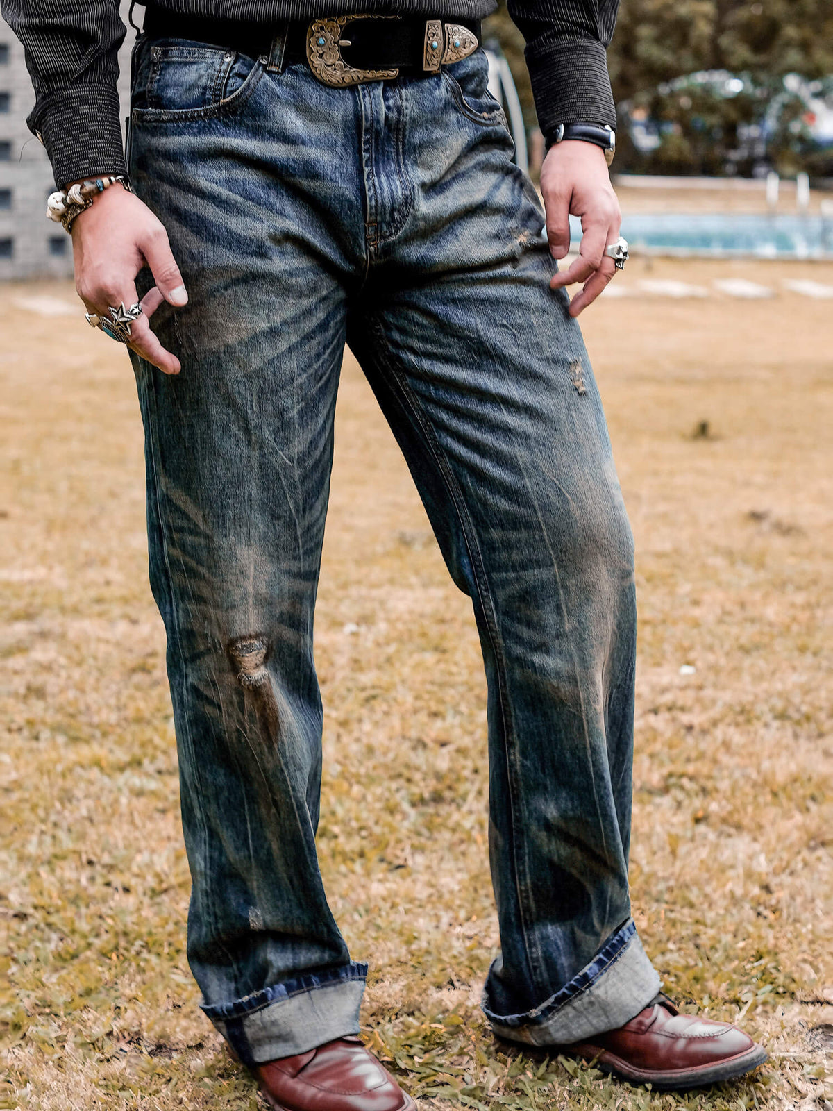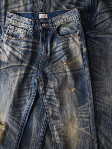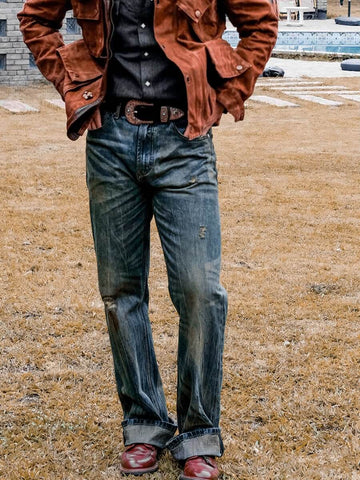 Embrace the rugged spirit of the Old West with our 1890s Nevada Jeans. Crafted from premium 13oz selvedge denim, these authentic bootcut jeans feature a lived-in heavy wash complete with natural-looking cat whiskers, strategic distressing, and vintage-inspired oil stains that tell a story of adventure and endurance.