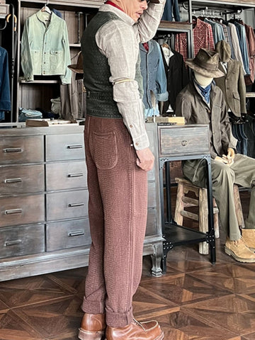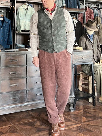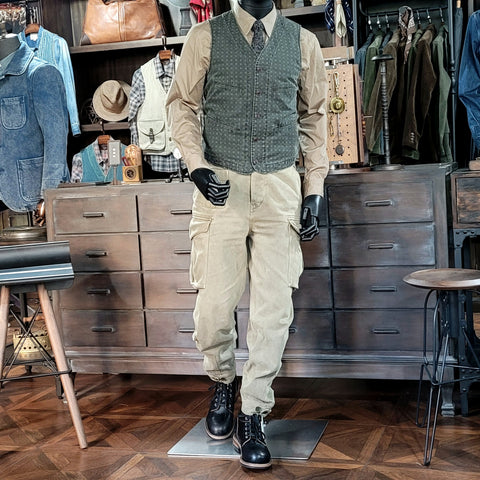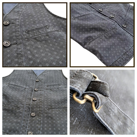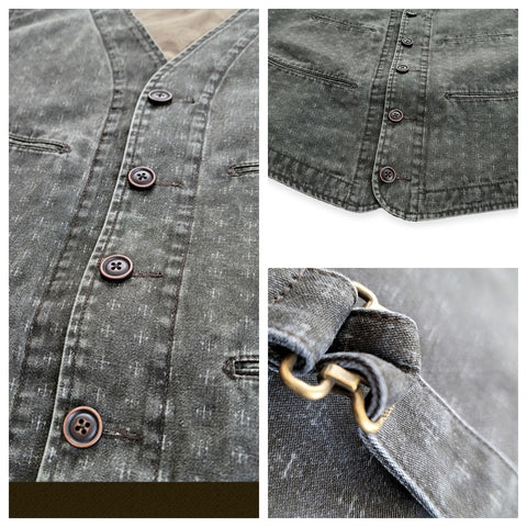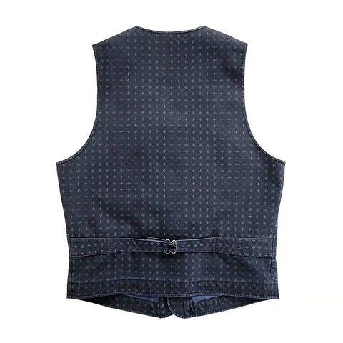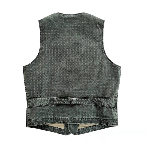 Introducing our Men's Washed Jacquard Vest, expertly crafted from 100% cotton. This versatile v-neck vest is designed with two functional pockets on the chest and waist, a secure button closure, and a tasteful brass buckleback.