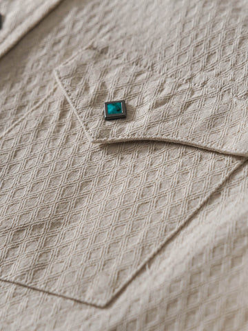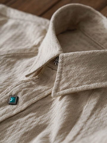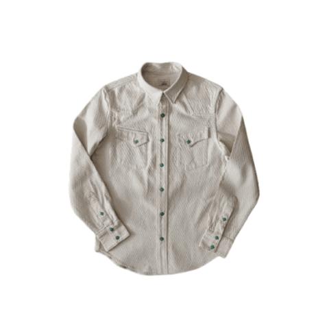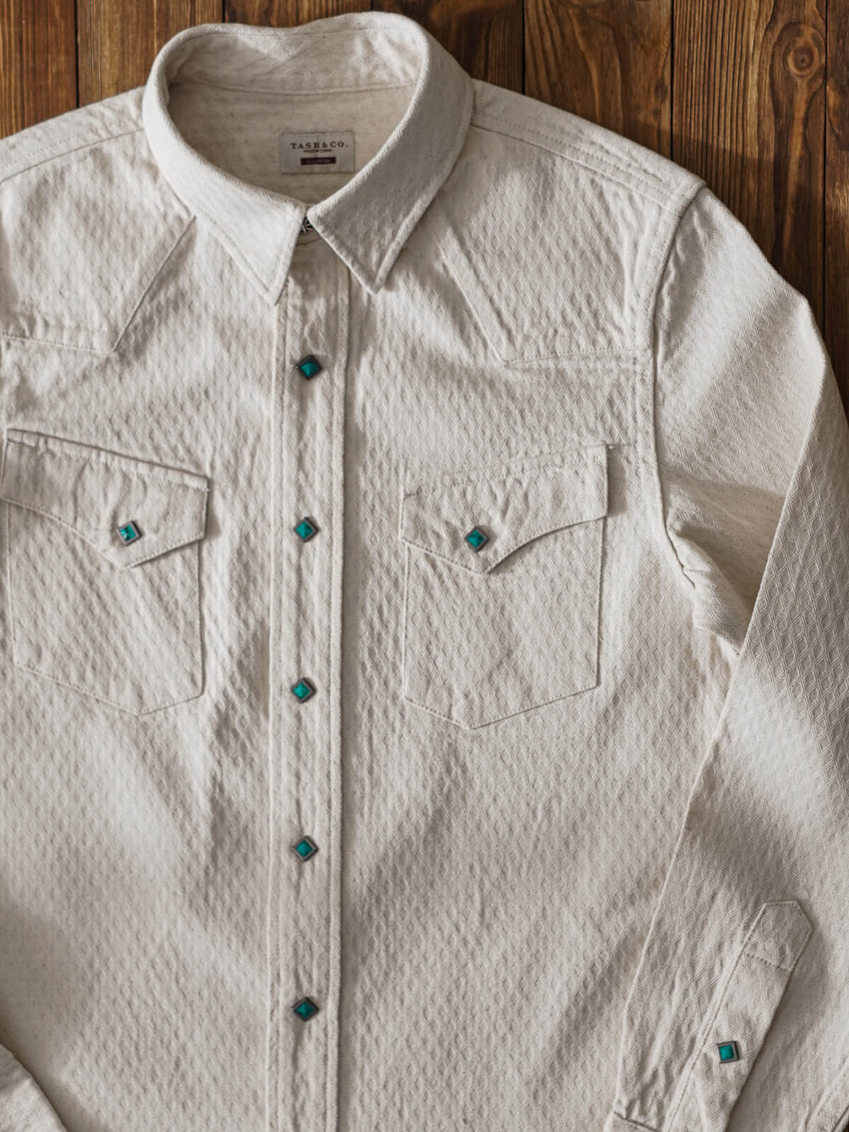 Classic American Vintage western shirt crafted from heavyweight 9.2oz cotton. The off-white fabric creates a timeless look, while turquoise buttons add a distinctive southwestern touch. Features traditional western-style chest pockets with slanted flaps. Pure cotton construction ensures breathability and durability, perfect for authentic western wear.