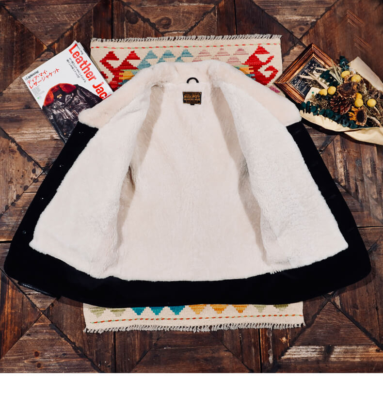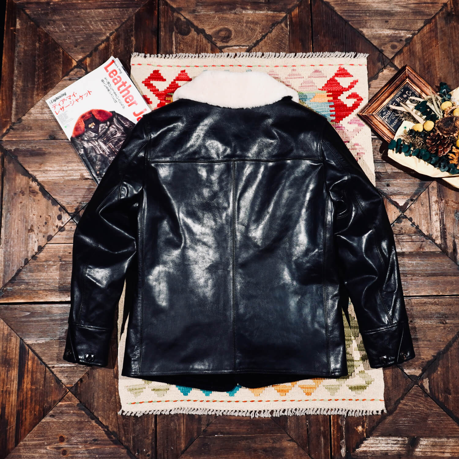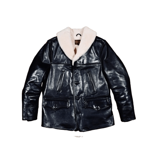 Inspired by signature ranch style, this jacket is available in premium 1.5mm horsehide leather. It features a cozy shearling collar, wool blend lining, and authentic period details. The double-breasted design includes horn button closure, complemented by two angled chest pockets and two lower flap pockets for practicality.