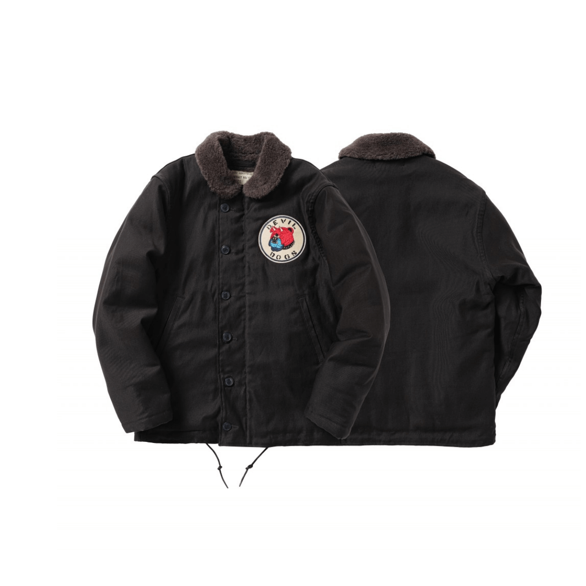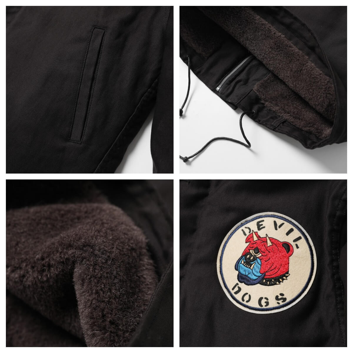It combines vintage design with practical function, offering a unique button & zip closure, two handy slant pockets, and an adjustable drawstring hem. The iconic USN dog patch on the chest completes the rugged, retro look.